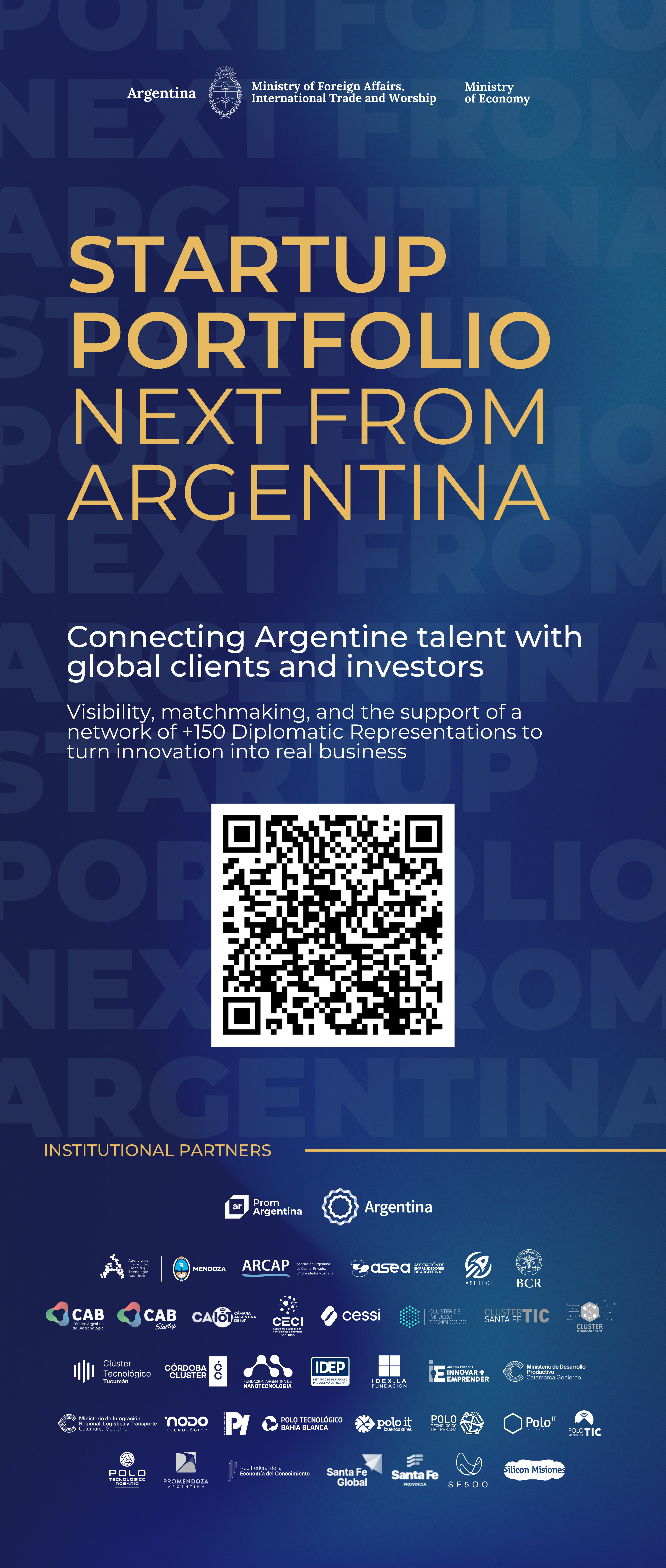 Next from Argentina: Startup Portfolio is a digital, bilingual, and institutionally validated platform that brings together Argentine startups and scaleups from across the Knowledge Economy, covering all verticals in one single space. Its goal is to increase international visibility, promote export and investment opportunities, and facilitate qualified connections with global clients and investors.