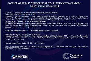 More information, including the cost of documents, payment process, and terms of participation - is available on CAMYEN’s official website: https://camyen.catamarca.gob.ar/licitaciones/
